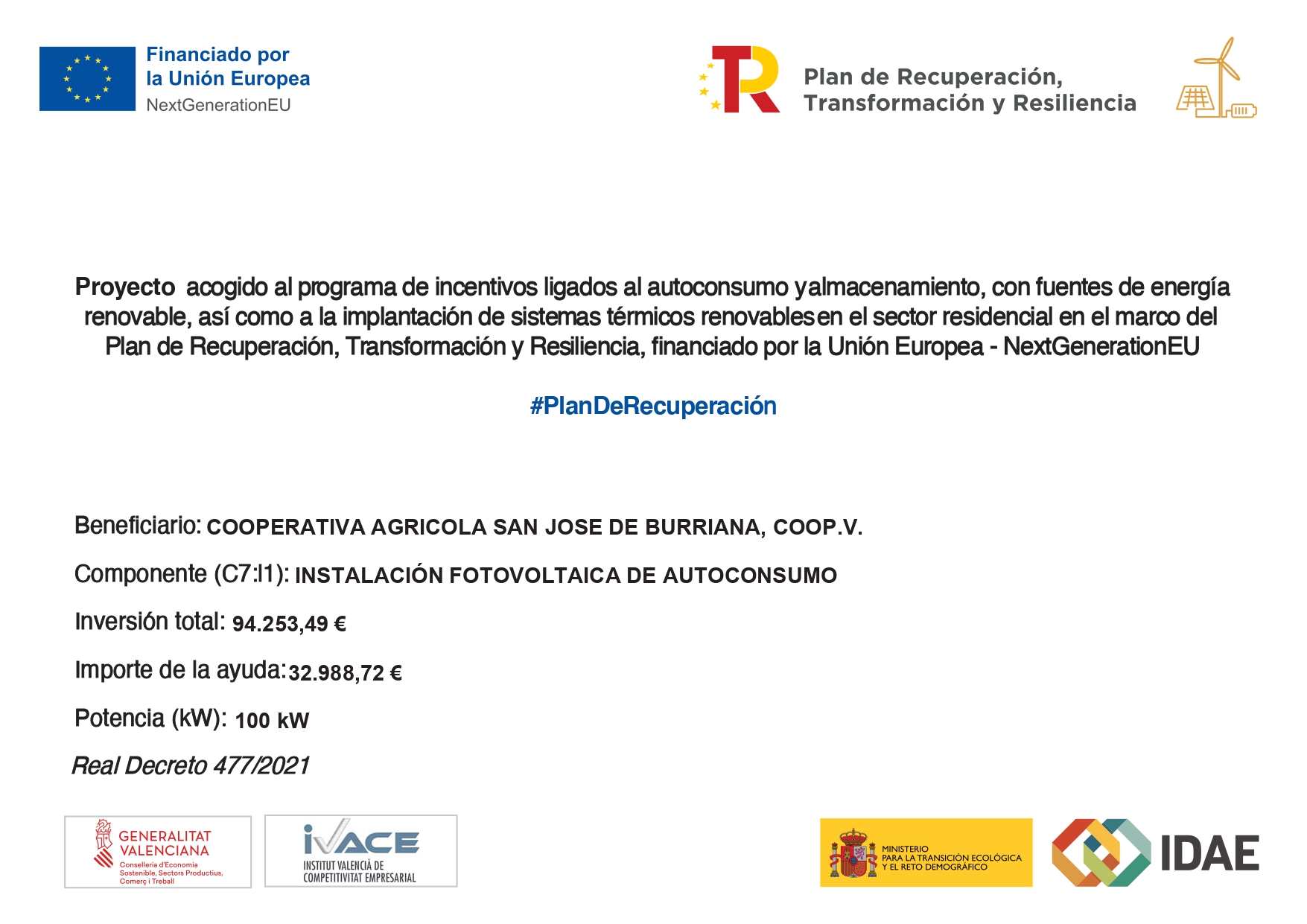 Apoyo recibido: 53.437,77 euros, subvención del IVACE a través del programa de Comunidades de Energías Renovables de la Comunitat Valenciana del año 2023